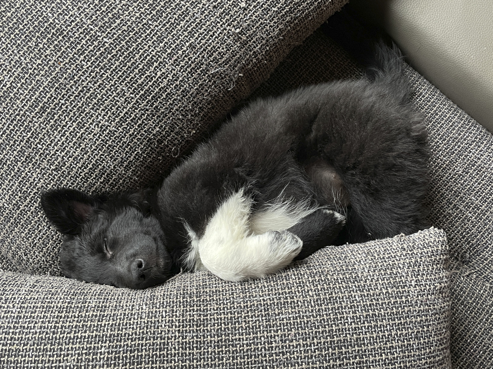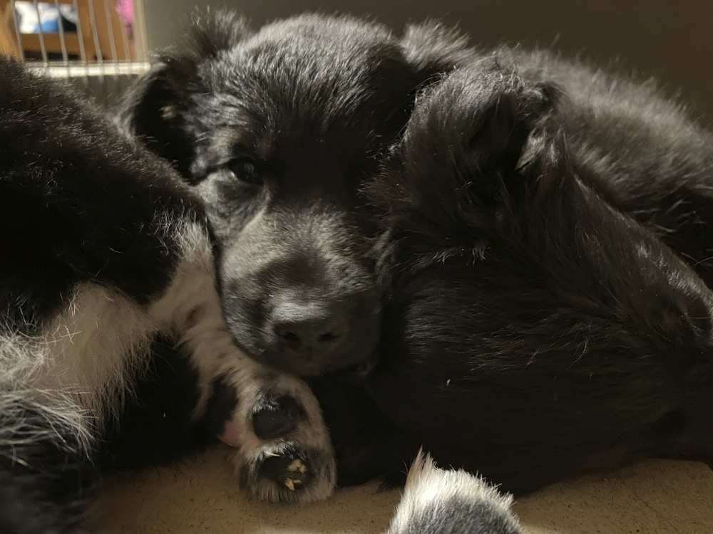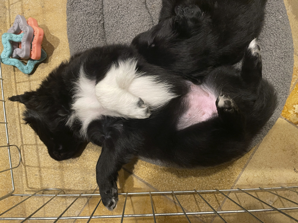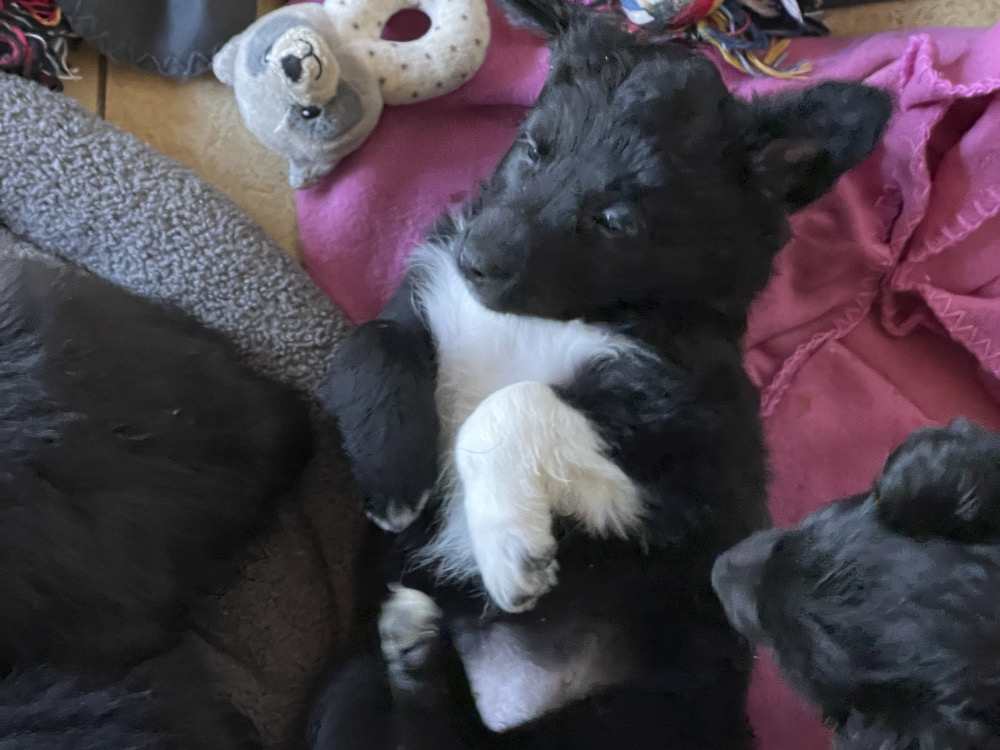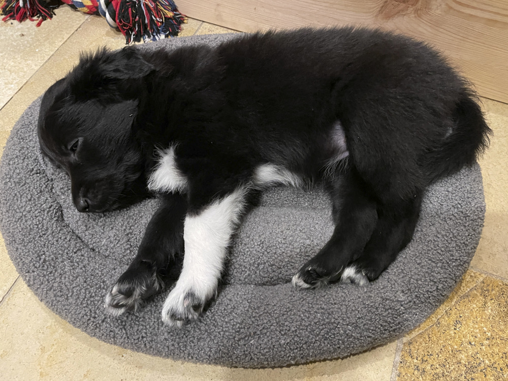 06.12.2021Auch Nikolaus wird zum größten Teil verschlafen, außer es wird gerade getrunken. Jeder Welpe macht es sich auf seine eigene Weise gemütlich.