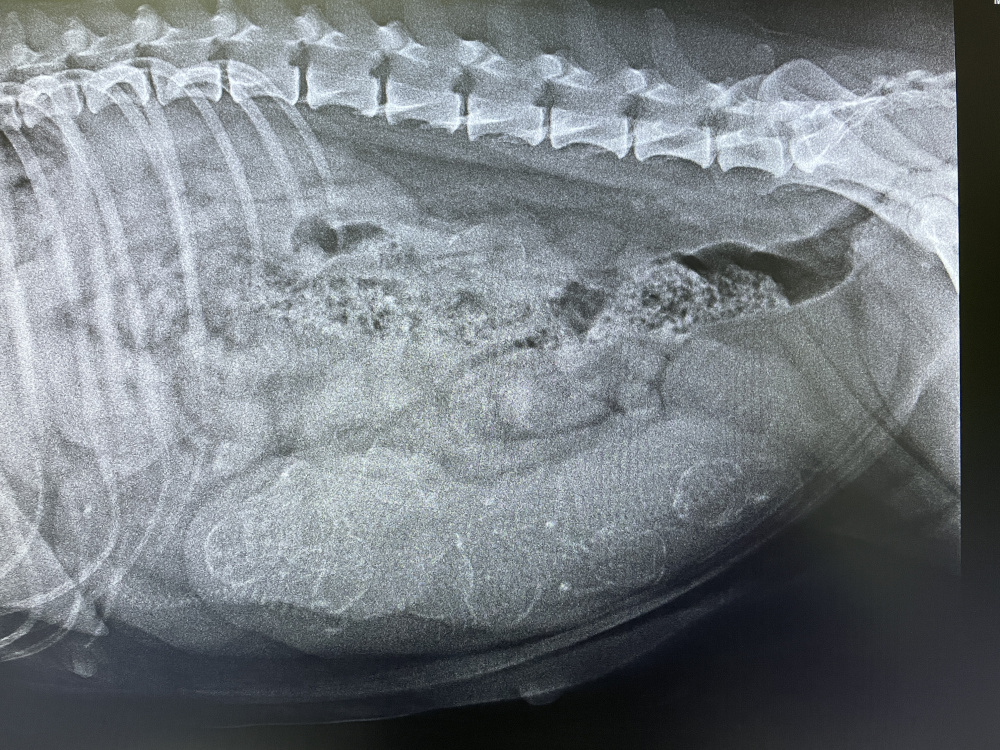 Nun wurde es spannend, denn der Tierarzt hatte ja 5 - 6 Welpen gezählt. Kommt jetzt also noch ein Welpe, oder war es das? Um 20:11 Uhr kam schließlich der 6. Welpe, nun sollten also alle draußen sein. Doch weit gefehlt, um 20:43 Uhr und 22:30 Uhr kamen noch die Welpen 7 und 8 zur Welt. Der erste Welpe, ein Weibchen, hat den ersten Tag leider nicht überlebt, wir haben ihr daraufhin den Namen Angel gegeben. Tag 028.11.2021Heute ist der 28.11.2021, der Tag des errechneten Wurftermins - und der erste Advent. Von Ankunft ist allerdings noch nicht viel zu spüren. Emma ist zwar den ganzen Tag schon ziemlich unruhig und auch ihr inzwischen ziemlich voluminöser Bauch hat sich schon deutlich gesenkt. Doch heute passiert noch nichts, weiter warten ist angesagt. Tag X-1018.11.202110 Tage noch bis zum errechneten Wurftermin, die letzte Untersuchung beim Tierarzt. Es wird ein Röntgenbild angefertigt um zu schauen, wieviele Welpen Emma in sich trägt. Vielleicht hätten wir noch ein paar Tage warten sollen, jedenfalls lässt es sich nicht ganz genau erkennen. Der Tierarzt zählt 5 - 6 Welpen.